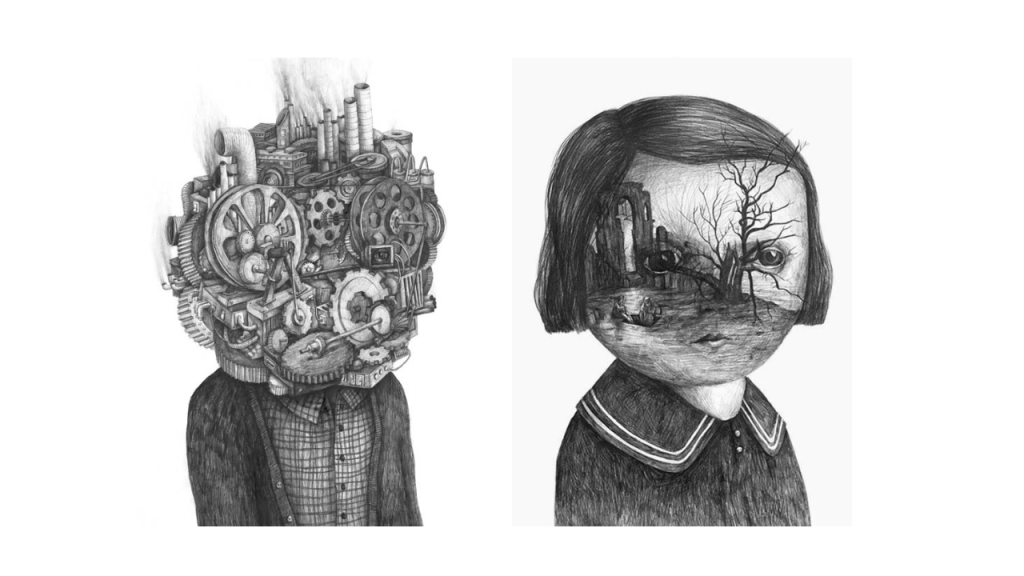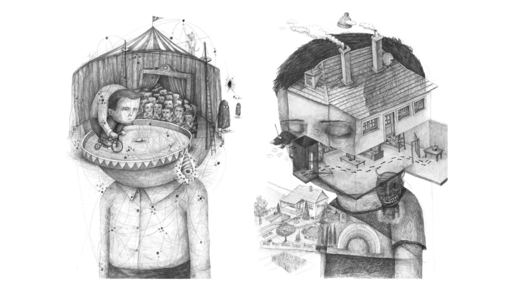 Stefan Zsaitsits is an Austrian artist and illustrator born in 1981, best known for his surreal graphite drawings that blur the boundary between the dream world and emotional reality. After studying at the University of Applied Arts in Vienna, Zsaitsits developed a signature style: introspective figures, distorted portraits, and scenes where thoughts literally spill out of heads.