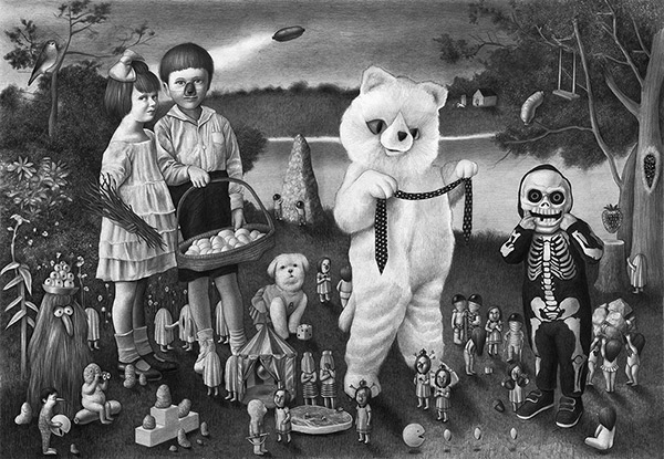 Step into Amandine Urruty’s surreal world, where childhood dreams and curious nightmares share the same living room. Her “family portraits” are anything but traditional — think dolls with secrets, mischievous pets, and faces that feel oddly familiar yet deliciously strange. Urruty’s charcoal drawings combine playfulness and unease in perfect balance, turning ordinary domestic scenes into fantastical tableaus that make you smile and squirm. Behind the soft textures and vintage charm lies a wink to life’s absurdity, reminding us that every family has its delightful oddities.